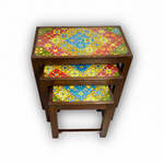 Each nesting table is crafted from solid mango wood, prized for its strength, sustainability, and rich natural grain. Skilled Indian artisans handcraft and polish the frame, while the tops feature individually painted ceramic tiles with intricate floral, geometric, or Mughal-inspired motifs. Every piece is unique, reflecting centuries-old woodworking and pottery techniques.
