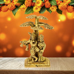 The sculpture depicts Lord Krishna in his classic flute-playing posture radiating peace and charm while Radha stands gracefully by his side representing love and devotion. Together, they embody spiritual harmony and divine connection. Above the figures, a finely detailed tree canopy symbolizes growth, shelter, and the beauty of nature. The hand-engraved leaves and branches add depth and visual appeal, making the idol a standout piece for both spiritual and decorative purposes.