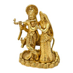 The sculpture depicts Radha and Krishna in a loving posture, standing beside a sacred cow symbolizing purity, compassion, and abundance. The intricate details highlight traditional motifs, enhancing both spiritual significance and decorative value. The gold antique finish adds warmth, luxury, and cultural authenticity to any environment.