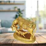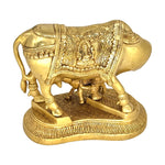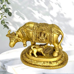 Every detail of the Kaamdhenu and her calf is meticulously hand-carved, showcasing the traditional Indian metalwork. The gold antique finish adds a regal touch and enhances the intricate motifs, creating a timeless decorative and spiritual piece.