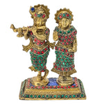 Handcrafted Brass Radha Krishna Statue with Stone Work and Yellow Antique Finish – 7 Inch Pooja Idol | Wholesale and Retail in UAE