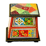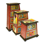 3-Drawer Unit (10.5” H x 9” W x 4.5” D): Hand-painted vintage motifs with multicolor borders and antique appeal, perfect for desktops or display areas.