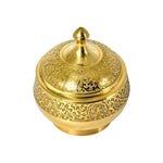 This elegant brass sugar bowl is meticulously handcrafted, featuring intricate embossing and a luxurious gold finish. Perfect for adding a touch of class to any table setting, it is ideal for serving sugar, dry fruits, nuts, or snacks. The bowls are made from high-quality brass, ensuring durability and a refined aesthetic for your tableware collection.