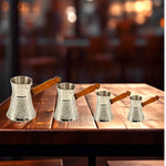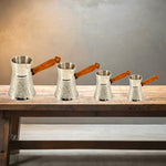 The pot features the classic Turkish cezve shape, with a rounded base and slightly flared top for controlled brewing. A long ergonomic wooden handle provides safe, heat-resistant handling, ensuring comfortable use even over open flame. Available in various sizes, the pot can prepare one to four cups, making it suitable for both personal servings and small gatherings.