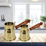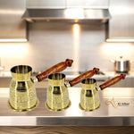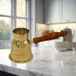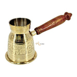 Brass Turkish Coffee Warmer Pot with Jali Work and Wooden Handle with gold finish | Wholesale & Online Retail