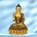 Crafted from premium solid brass, the statue ensures long-lasting durability and a natural shine that ages gracefully with time. The surface is finished with a golden antique polish, giving it a sacred and vintage look. Each piece is handmade and hand-engraved by Indian artisans, featuring intricate detailing of robes, lotus bases, and symbolic Buddhist motifs. This uniqueness makes every statue a collectible work of art.
