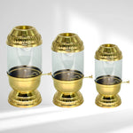 Each diya is meticulously handcrafted from 100% pure brass, ensuring superior durability and a radiant glow. The glass chimney protects the flame from wind while enhancing the diya’s warm, serene light. The adjustable bati (wick) leverallows easy control of the flame height, providing convenience during long hours of prayer or festival lighting. Every piece is polished to perfection and tested for balance, making it ideal for temples, homes, and ceremonial use.