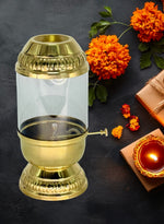 Illuminate your spiritual space with the Pure Brass Akhand Jyoti Diya, a handcrafted masterpiece designed for lasting brightness, devotion, and beauty. Expertly made by skilled Indian artisans, this diya combines traditional craftsmanship with practical design. Featuring an adjustable wick lever, a protective glass cover, and an elegant antique gold finish, it stands as both a functional lamp and a symbol of purity and faith.