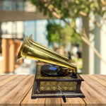 Each gramophone is handcrafted in India using premium-grade solid wood and hand-polished brass speakers, designed to replicate the grandeur of early 20th-century gramophones. The natural wood finish box features vintage-style detailing, while the dual brass horns provide a dramatic and luxurious visual presence. With options for manual wind-up operation or upgraded versions with Bluetooth and AUX compatibility, this gramophone blends tradition with modern utility, making it a standout collectible for décor and music lovers in Dubai, Sharjah, and Abu Dhabi.