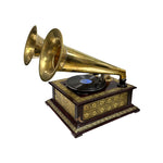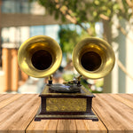 Its dual brass horn design makes it visually commanding, while its functional record player feature makes it a conversation piece that appeals to collectors and music enthusiasts alike.